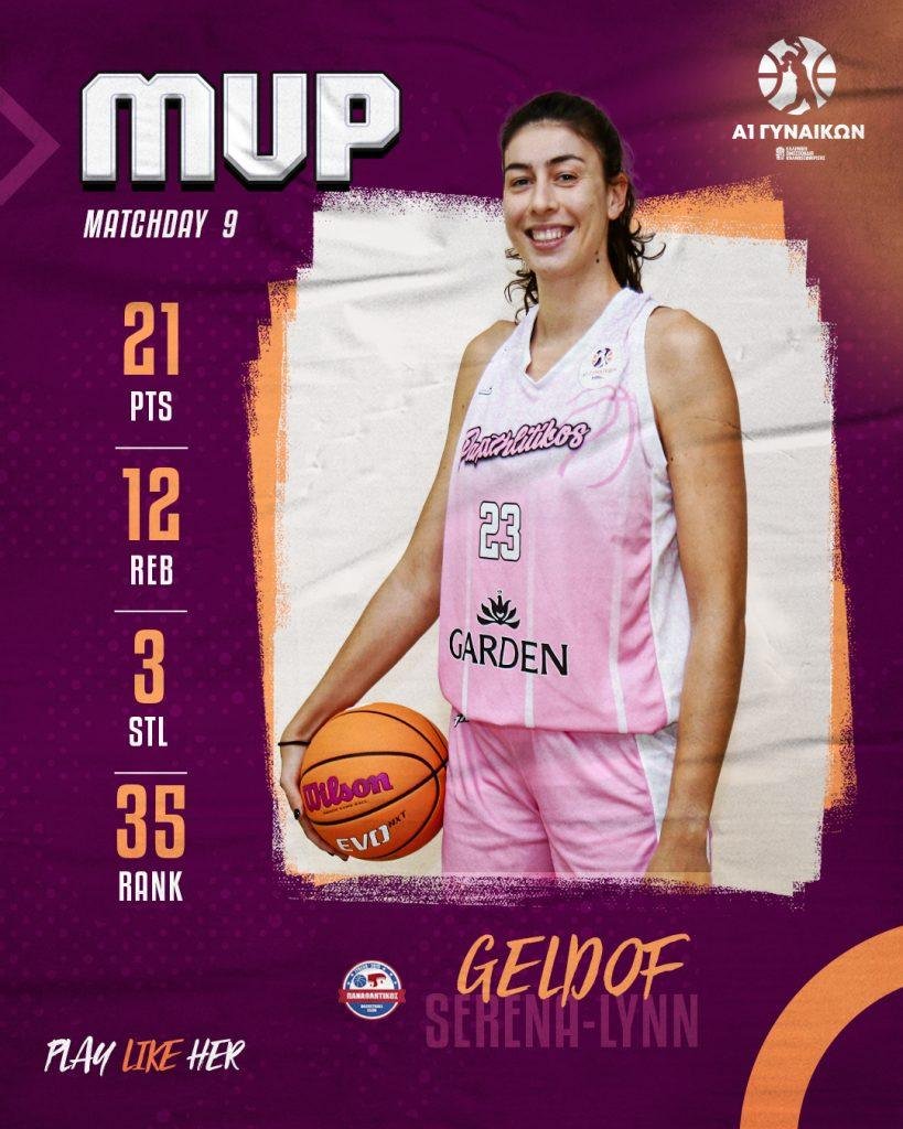 Η αθλήτρια του Παναθλητικού, Σερένα Λιν Γκέλντοφ αναδείχθηκε πολυτιμότερη - δεύτερη φορά - της 9ης αγωνιστικής της Α1 Γυναικών, ενώ η Νάγια Στολίγκα του Πρωτέα κέρδισε άλλο ένα βραβείο MVP NextGen.