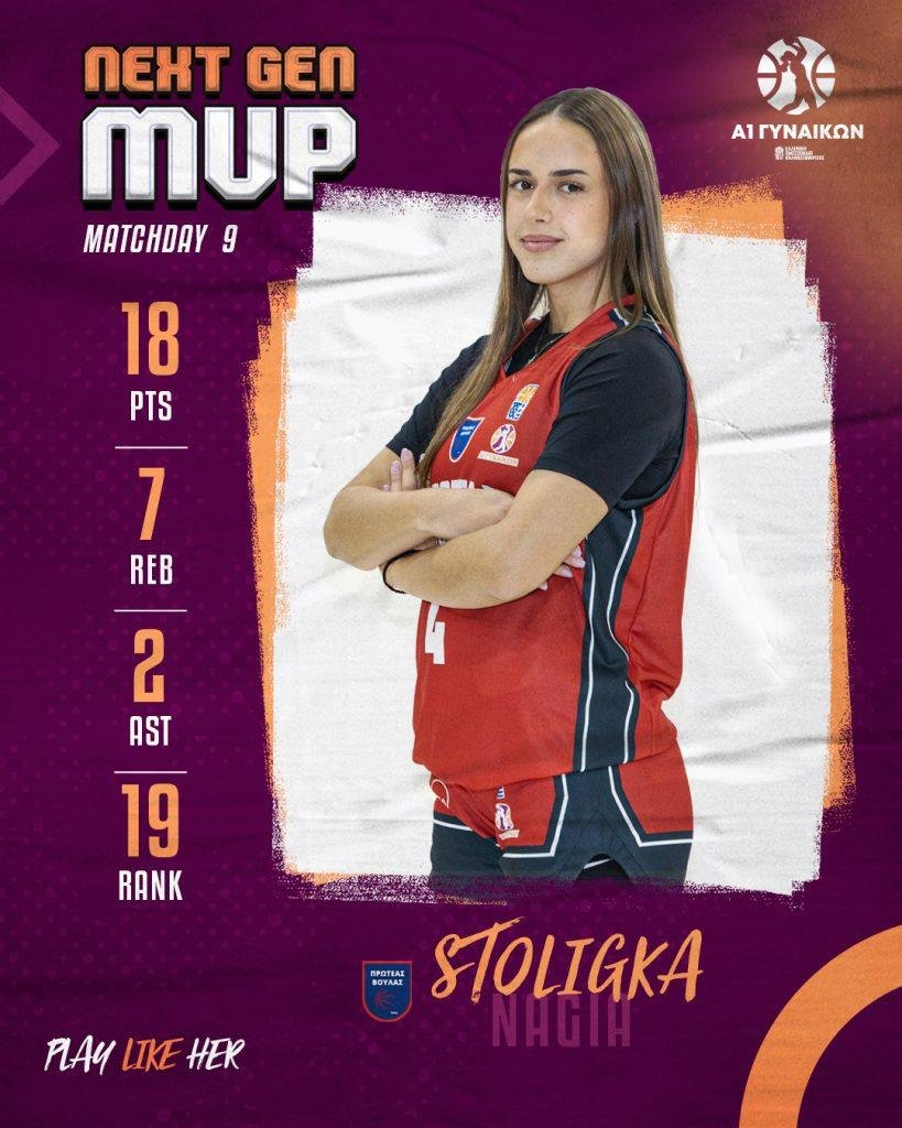 Από την άλλη η Νάγια Στολίγκα που αναδεικνύεται για τρίτη φορά MVP Next Gen (κάτι ανάλογο είχε καταφέρει την 3η και την 4η Αγωνιστική) στην ήττα του Πρωτέα Βούλας από τον ΠΑΣ Γιάννινα με 75-68 είχε 18 πόντους, 7 ριμπάουντ, 2 ασίστ, ένα κλέψιμο συγκεντρώνοντας 19 στο σύστημα αξιολόγησης μετά από 38’55’’ συμμετοχής.