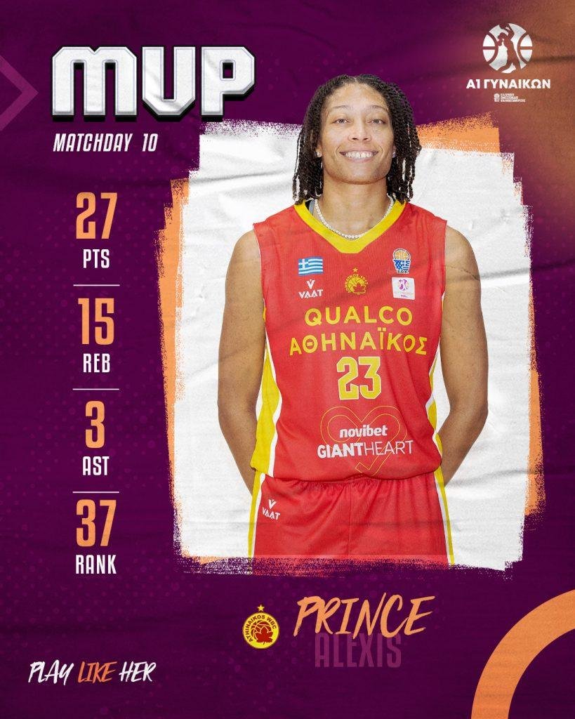 Η Αλέξις Πρινς στη νίκη του Αθηναϊκού Qualco με 79-70 επί του Ολυμπιακού είχε 27 πόντους, 13 ριμπάουντ, 3 ασίστ και 37 στο σύστημα αξιολόγησης μετά από 36’57”συμμετοχής κατακτώντας τον «τίτλο» της κορυφαίας για την 10η Αγωνιστική.