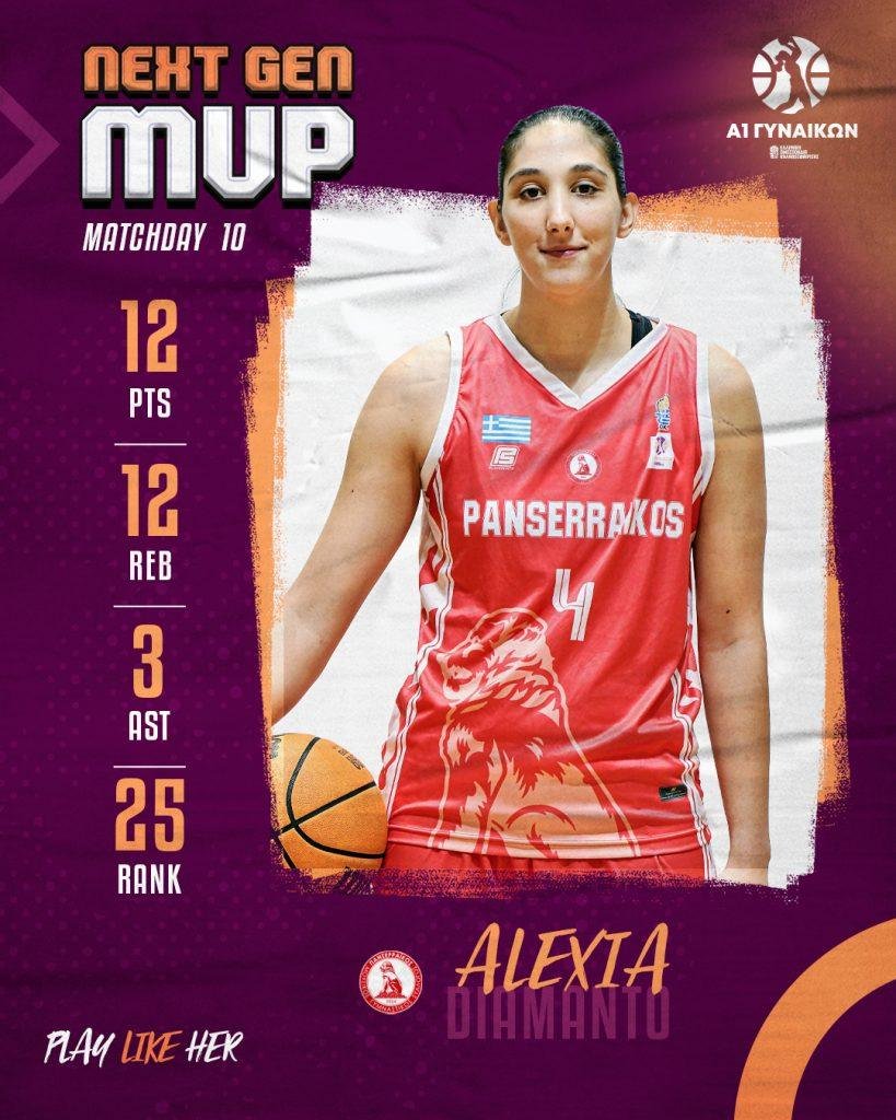 Από την άλλη η Διαμάντω Αλεξιά του Πανσερραϊκού κερδίζει για τρίτη φορά τη φετινή αγωνιστική περίοδο τη διάκριση της MVP Next Gen. Στην νίκη της ομάδας της με 80-51 απέναντι στην Ανόρθωση Βόλου είχε 12 πόντους, 12 ριμπάουντ, 3 ασίστ, ένα κλέψιμο, 2 τάπες και 25 στο σύστημα αξιολόγησης μετά από 21’28” συμμετοχής.