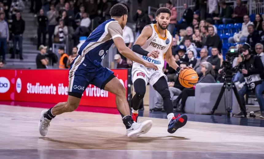 Ο Προμηθέας ταξίδεψε στην Γερμανία με στόχο την νίκη που θα τον έφερνε πιο κοντά στην πρόκριση των play in του BCL. Η ομάδα της Χάιντελμπεργκ πήρε από νωρίς το προβάδισμα στην αναμέτρηση, καθώς οι παίκτες του Γιώργου Λιμνιάτη δεν κατάφεραν να κόψουν εύκολα το σερί 7-0 των Γερμανών. Στην πορεία κατάφεραν να μειώσουν και να πάνε στους πάγκους με την λήξη της πρώτης περιόδου με το σκορ στο 21-17. Με την έναρξη του δευτέρου δεκαλέπτου, οι φιλοξενούμενοι είχαν περισσότερες λύσεις, με τον Χάρις και τον Γκρέι να μπαίνουν στην εξίσωση, με το σκορ του πρώτου μέρους να κλείνει στο 38-37, με τους Αχαιούς να έχουν τον τρόπο να πλησιάσουν κοντά στο καλάθι, αλλά και από την περίμετρο.