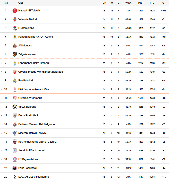 Το σύνολο του Γιώργου Μπαρτζώκα υποχώρησε πλέον στο 8-7, έχοντας μάλιστα και ένα παιχνίδι λιγότερο απέναντι στη Φενέρμπαχτσε, ενώ οι «νυχτερίδες» με ρεκόρ 11-5 συνεχίζουν να βρίσκονται ψηλά στη βαθμολογία, διατηρώντας σταθερά πορεία προς την πρώτη τετράδα.