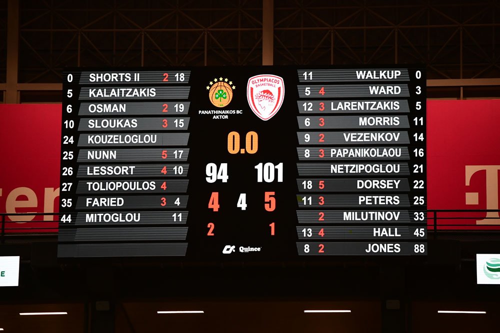Ο Ολυμπιακός νίκησε εκτός έδρας τον Παναθηναϊκό AKTOR με 101-94 και εξασφάλισε την πρώτη θέση της κανονικής περιόδου.