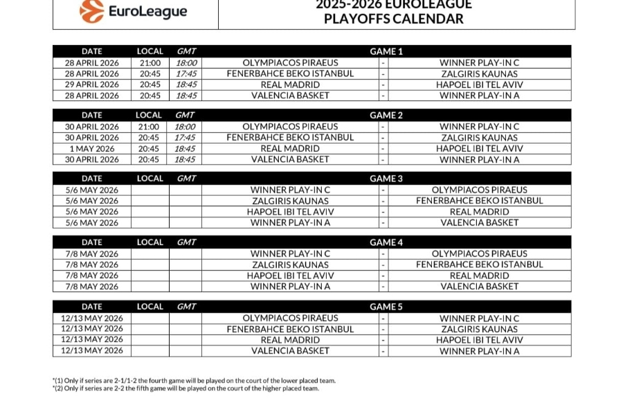 Η Euroleague ανακοίνωσε το αναλυτικό πρόγραμμα για τα πρώτα παιχνίδια των playoffs, με τη δράση να ξεκινά επίσημα στις 28 Απριλίου.